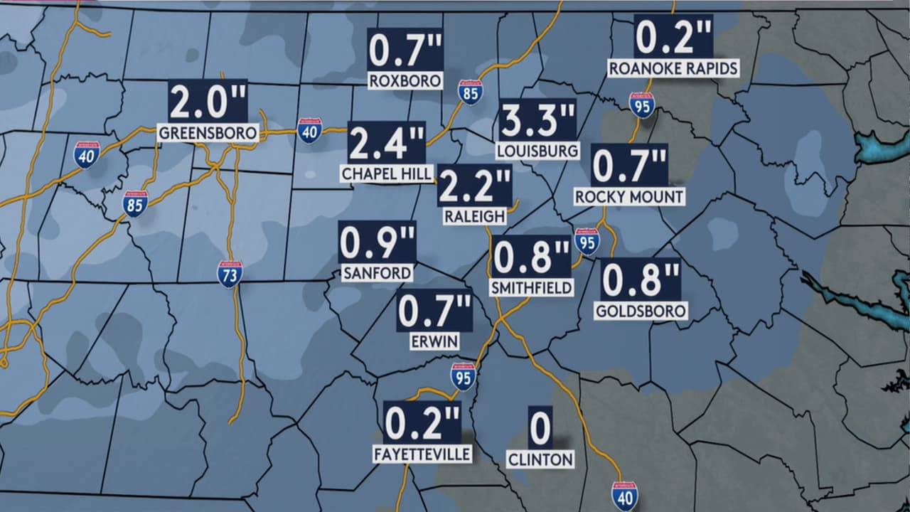 Una advertencia de clima invernal fue emitida en sectores del área central hasta la 1 a.m. del sábado, desde el condado de Moore hasta el condado de Warren. Los acumulados de nieve podrían superar las 2” en ciudades como Greensboro, Chapel Hill, Raleigh y Louisburg.