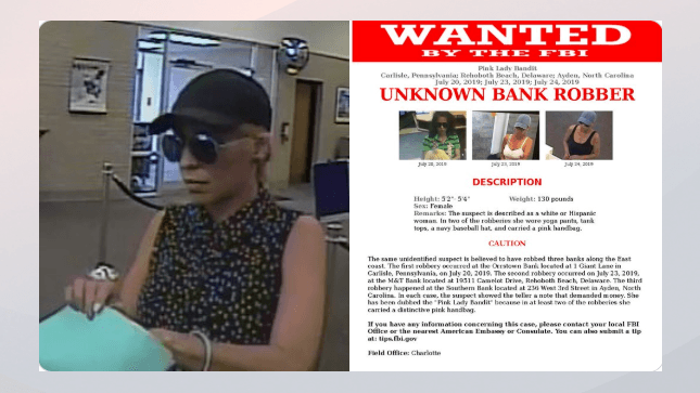 La mujer del bolso rosa o 'Pink Lady Bandit', fue detenida este domingo junto con su presunto cómplice, después de que varias agencias los encontraran en el Hotel Charlotte Speedway Inn & Suites en West Sugar Creek Road. La policía le colocó ese apodo debido a que en dos de los robos portaba el distintivo bolso rosa.