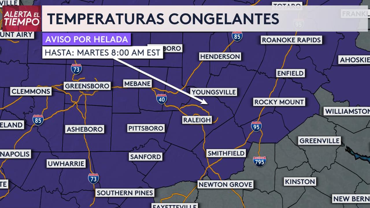 Un aviso por helada fue emitido en Raleigh, Greensboro y Sanford, entre otras ciudades de Carolina del Norte. Las temperaturas también podrían llegar a los 35 grados en Fayetteville y Clinton.