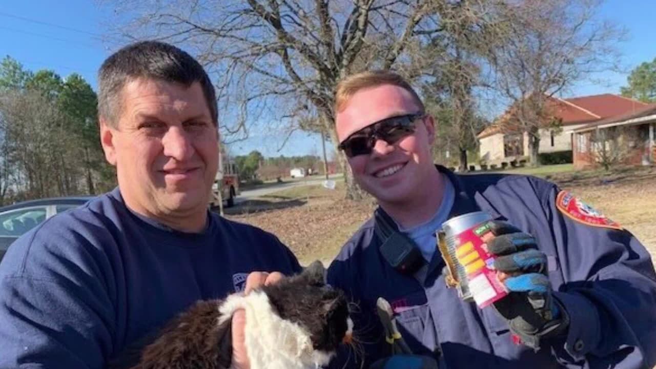 Bomberos de Clayton rescatan a gato atascado en lata de comida