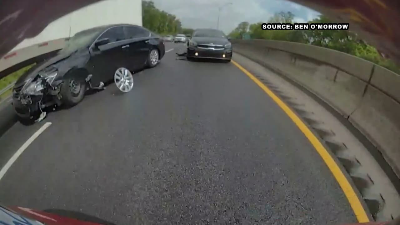 Al ver el video de las distintas cámaras en su vehículo, O'Morrow confiesa que el incidente pudo haber sido mucho peor. El auto involucrado quedó completamente aplastado y el chofer estuvo a punto de ser impactado por uno de los neumáticos del camión.