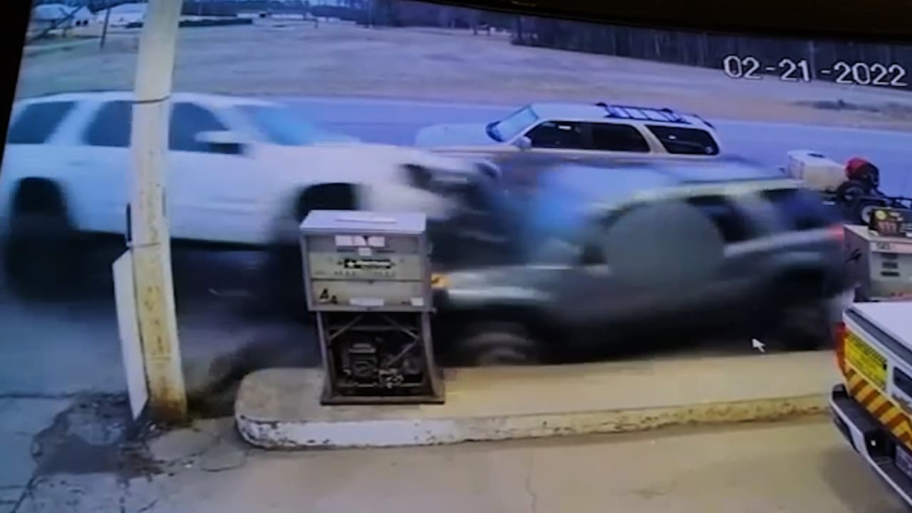 Cámara de seguridad capta impactante choque contra una gasolinera en Zebulon