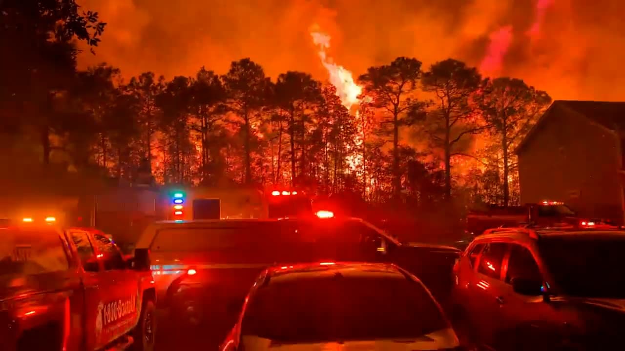 Imágenes se grabadas el domingo 2 de marzo en el vecindario Walkers Woods, en Myrtle Beach, muestran las llamas del incendio Carolina Forest, el más grande que se ha reportado en la región. Hasta el domingo en la tarde, había quemado más de 1,600 acres y estaba contenido en un 30%.