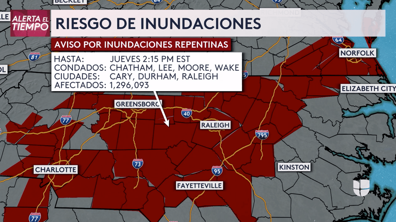 Un aviso de inundaciones repentinas está vigente en los condados de Alamance, Chatham, Durham, Harnett, Lee, Moore, Orange y Wake hasta las 4:30 p.m. Una advertencia de inundaciones fue emitida hasta las 7 pm en la mayor parte del área central.