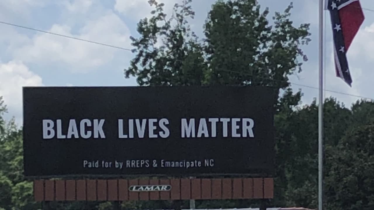 Una valla publicitaria del movimiento "Black Lives Matter" fue colocada junto a una gigantesca bandera confederada que ondeaba en la autopista US-64 de Pittsboro, en Carolina del Norte.