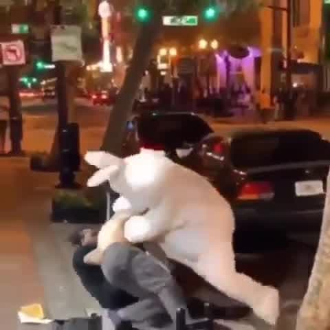 Un hombre vestido de conejo de pascua sale al rescate cuando una mujer está siendo asaltada presuntamente. En el vídeo que grabó un testigo, podemos ver cómo el conejo de pascua le propina tremenda paliza al sospechoso.