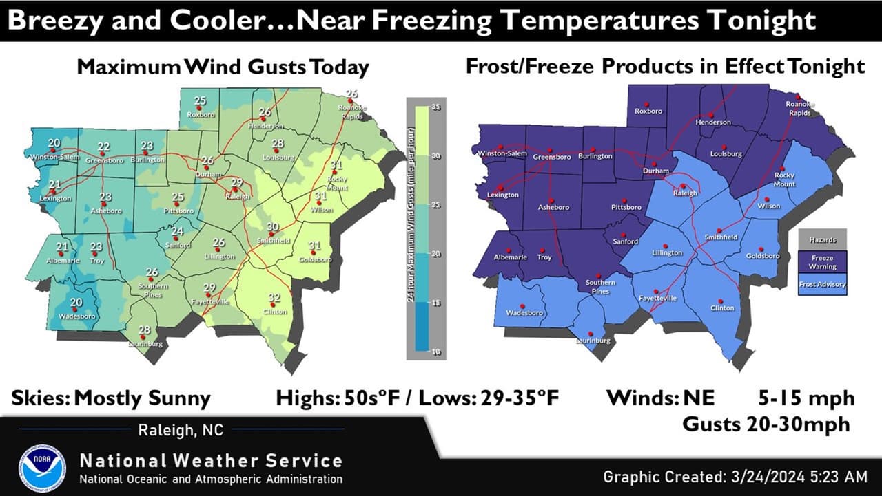 RALEIGH, Carolina del Norte. - Ciudades en Carolina del Norte pasarán una noche con temperaturas y sensaciones térmicas muy cerca del punto de congelación, el aviso se activó a las 9:00 a.m. de este domingo y termina durante la mañana del lunes 25 de marzo.