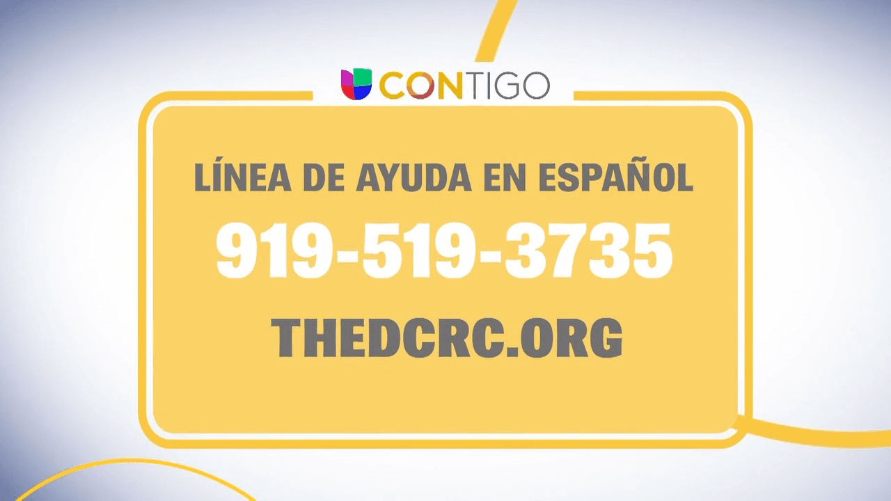 Para más información, puede llamar a la linea de ayuda 24/7 al 919-519-3735 o visite la siguiente página: THEDCRC.ORG