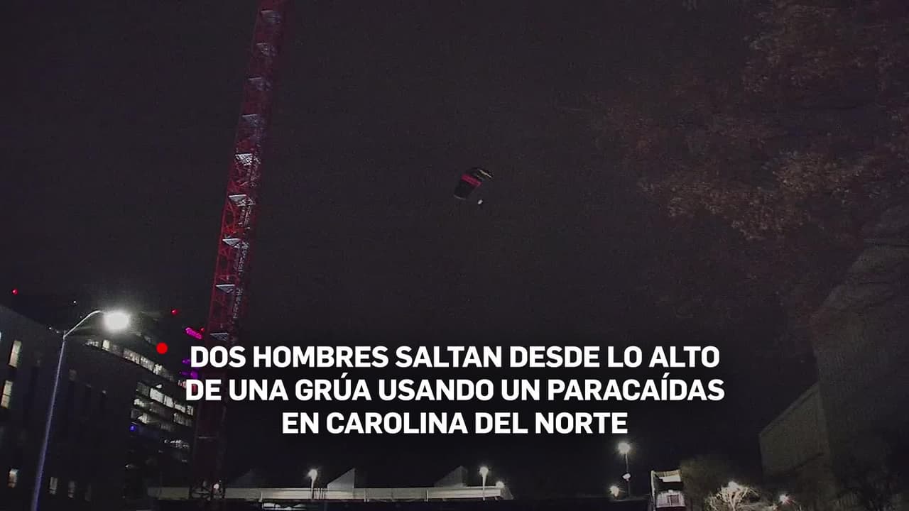 Dos hombres saltan desde lo alto de una grúa usando un paracaídas en Carolina del Norte