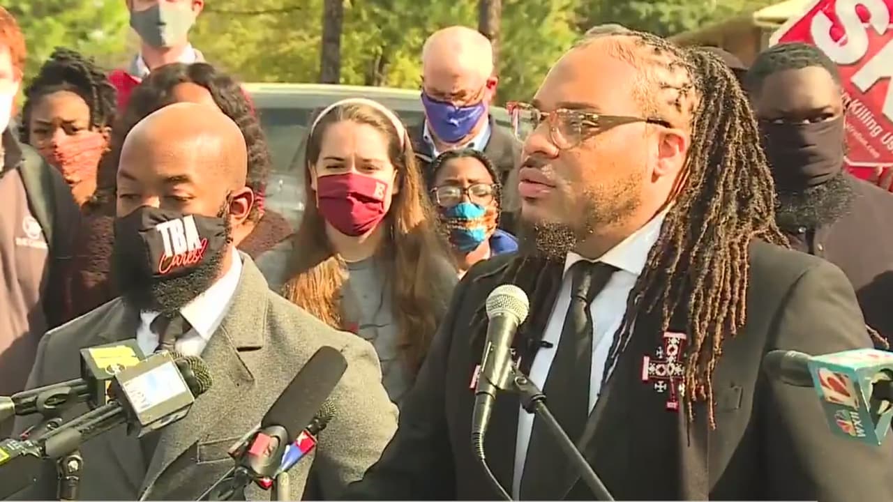 El reconocido abogado de derechos civiles, Ben Crump, quien representa a la familia de George Floyd, se reunió con el reverendo Greg Drumwright en Graham, Carolina del Norte, para informar que los arrestos realizados a manifestantes que marcharon el 31 de octubre a las urnas fueron "acusaciones inventadas".