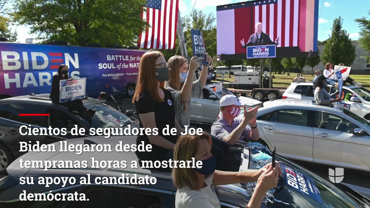 "Son las elecciones más importantes en mucho tiempo (...). Tenemos una enorme oportunidad de reconstruir la economía", dijo Biden a cientos de personas que aguardaban en su vehículos, una peculiar modalidad en tiempos de coronavirus.