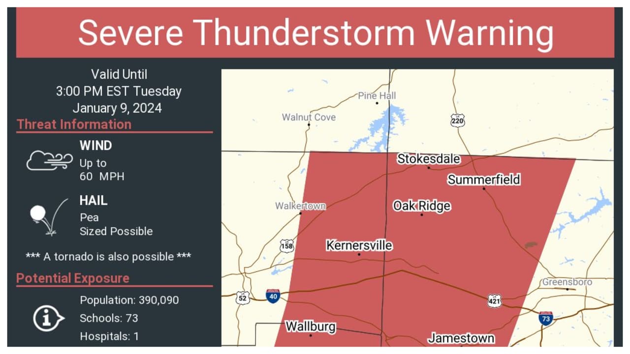 La advertencia de tormenta severa continúa para High Point NC, Kernersville NC y Summerfield NC hasta las 3:00 p.m. EST.