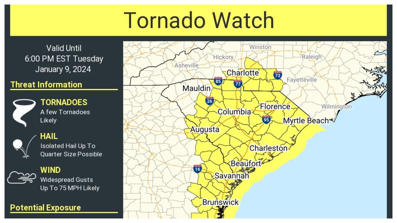 Además se emitió una alerta de tornado para partes de Florida, Georgia, Carolina del Norte y Carolina del Sur hasta las 6 p.m. EST.
