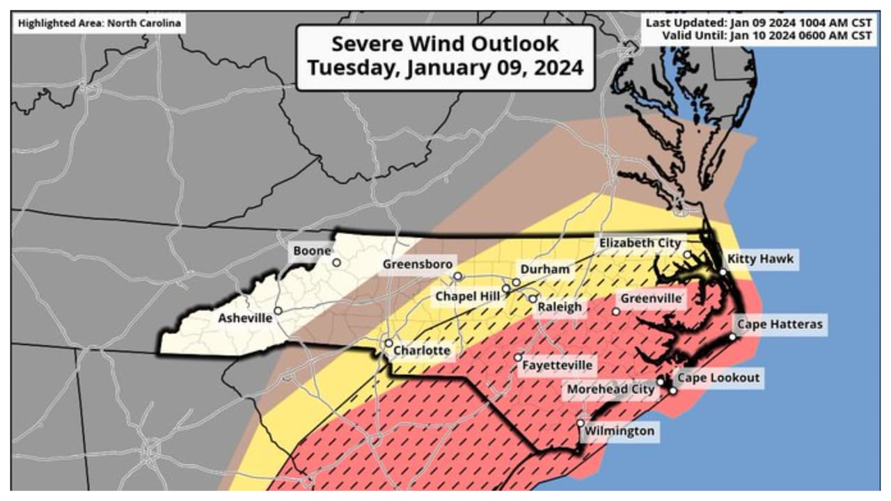RALEIGH, Carolina del Norte.- Carolina del Norte se prepara ante la llegada de tormentas severas para el centro estado en las próximas horas. De 1 a 9 pm se esperan posibles ráfagas de viento en línea recta dañinas y tornados aislados.