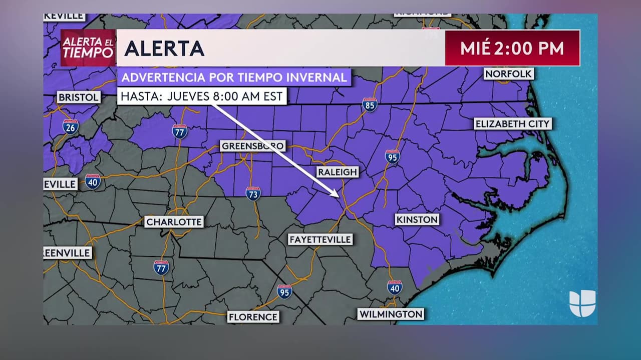 Una advertencia de tiempo invernal fue emitida desde las 9 p.m. del miércoles hasta las 8 a.m. del jueves. Raleigh podría ver hasta 1.5" de nieve. Goldsboro y Rocky Mount tendrían hasta 3.5”.