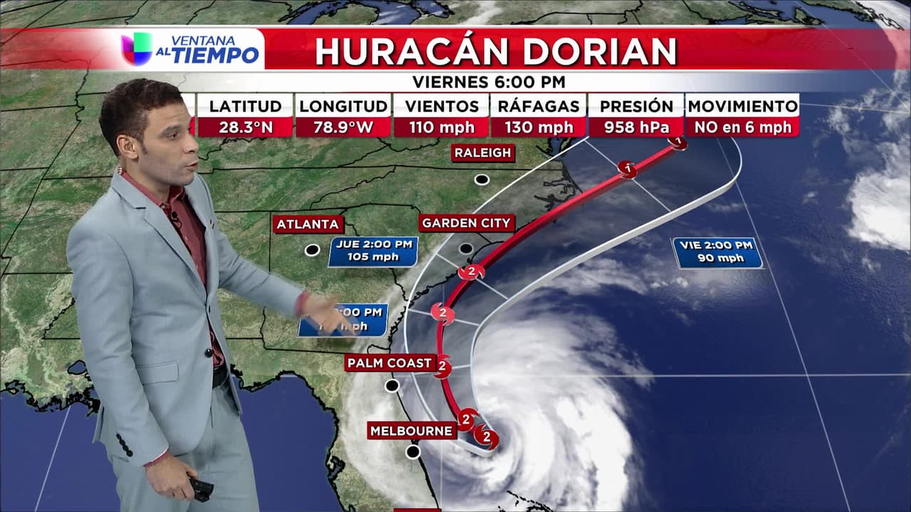 Con vientos sostenidos de 110 mph el huracán Dorian continúa su trayectoria por la región costera de Carolina del Sur y se espera que sea finales de semana que pueda llegar a Carolina del Norte, por lo que se espera una acumulación de lluvia de hasta 12 pulgadas en la costa.