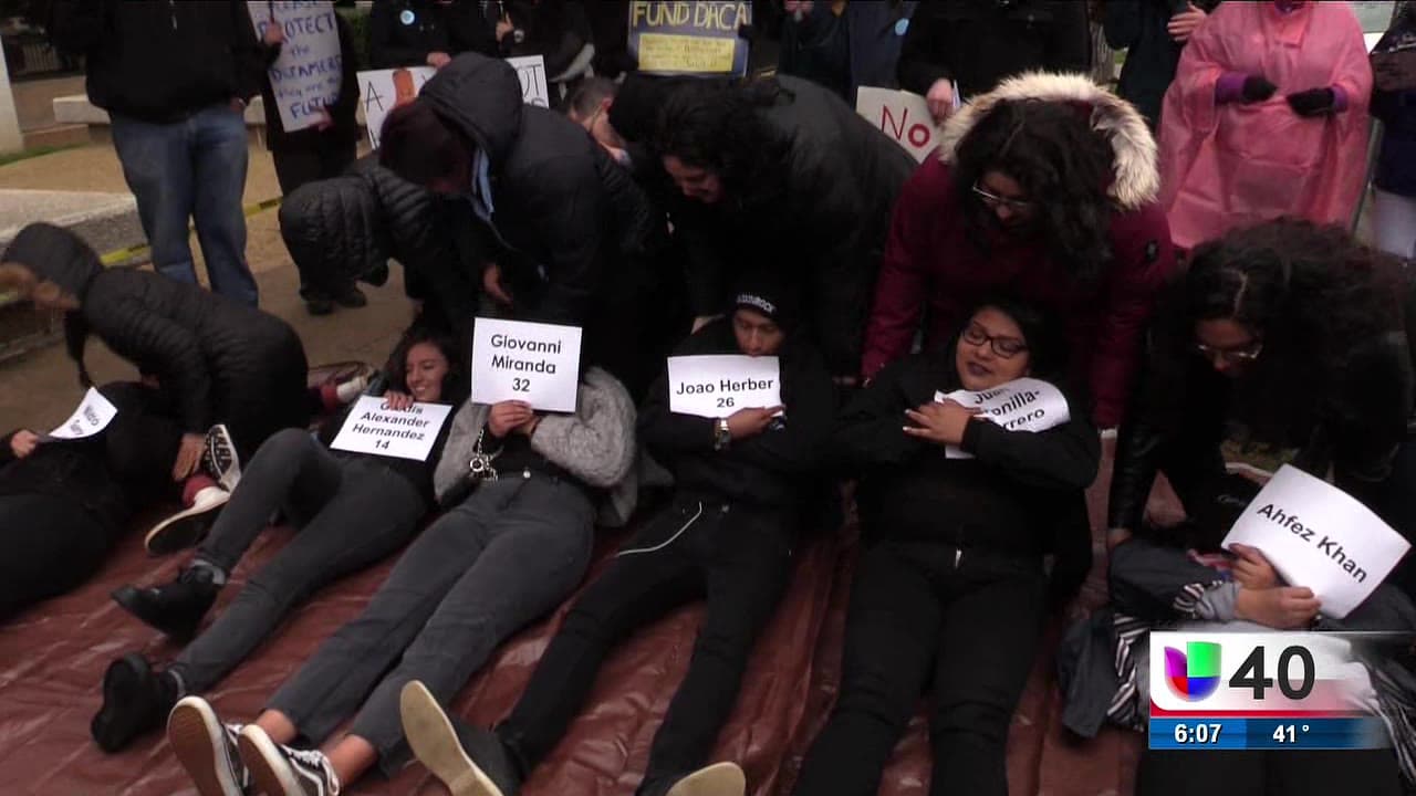 Los manifestantes llegaron vestidos de negro y se acostaron en el piso como símbolo de la muerte de los sueños de los beneficiarios de DACA, así como de cientos de personas deportadas.