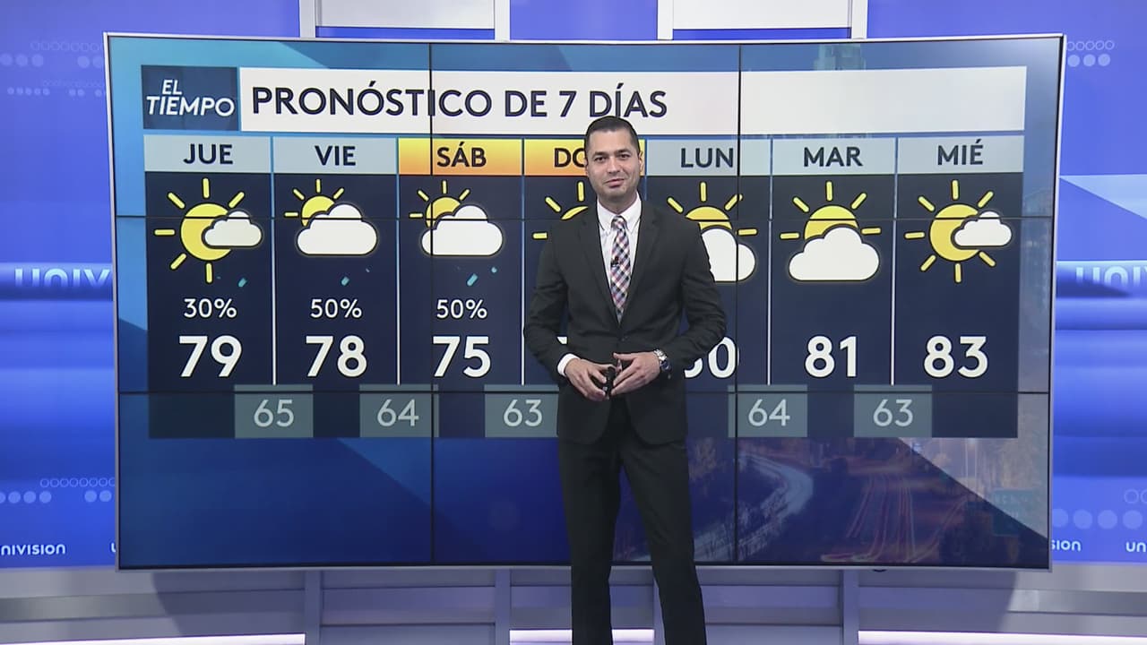 Esta jornada de jueves estará marcada por la alta nubosidad, con algunas probabilidades de lluvias aisladas durante horas de la tarde. Las temperaturas llegarán a niveles agradables, en el rango de los 79 grados.