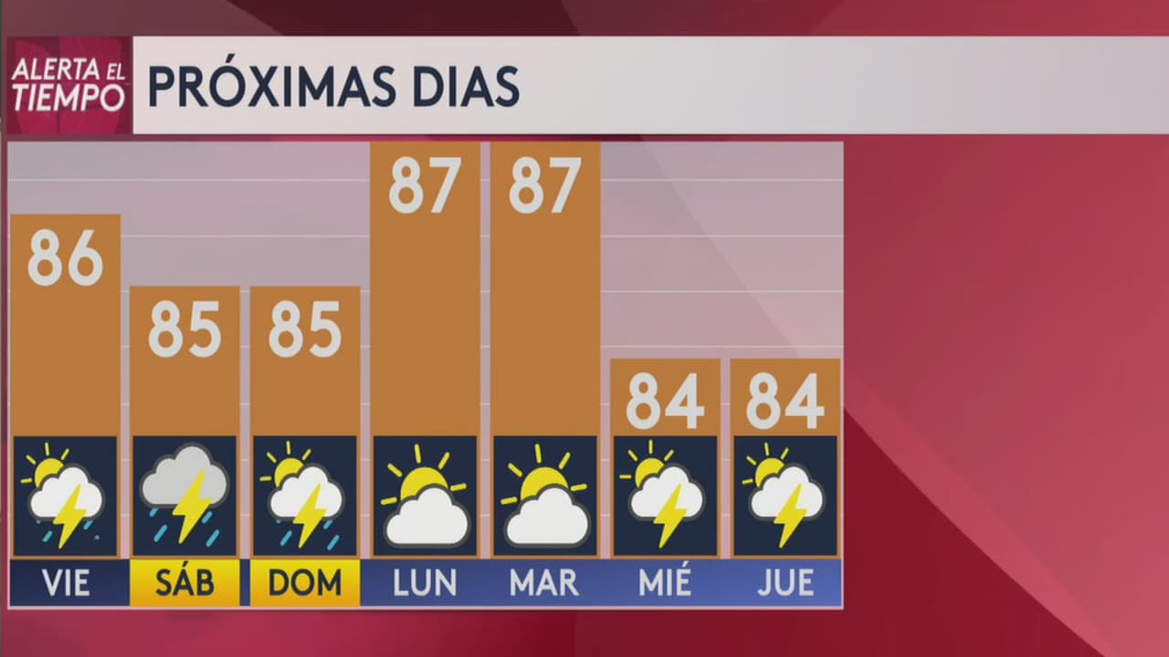 - Las tormentas eléctricas dispersas podrían regresar entre la tarde del lunes y el martes de la próxima semana.