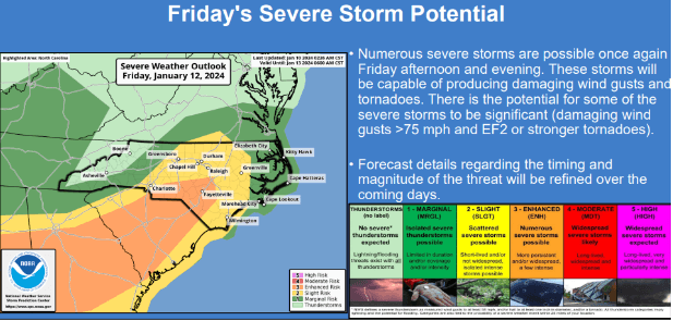 El Centro de Predicción de Tormentas ha colocado partes del sur de Piedmont y Sandhills en un Riesgo Mejorado (Nivel 3 de 5) de numerosas tormentas severas, con gran parte del centro de Carolina del Norte y partes del este de Carolina del Norte en un Riesgo Leve (Nivel 2 de 5) de tormentas severas dispersas. tormentas.