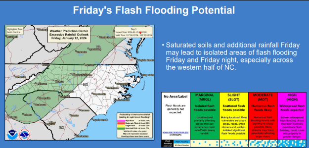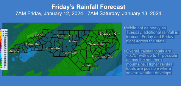 Desde el viernes por la mañana, las precipitaciones al suroeste de Carolina del Norte se extenderán por todo el estado durante el día. Si bien no se espera que las precipitaciones totales sean tan grandes como las que cayeron el martes, será posible que se produzcan áreas aisladas de inundaciones repentinas en todo el oeste de Carolina del Norte.