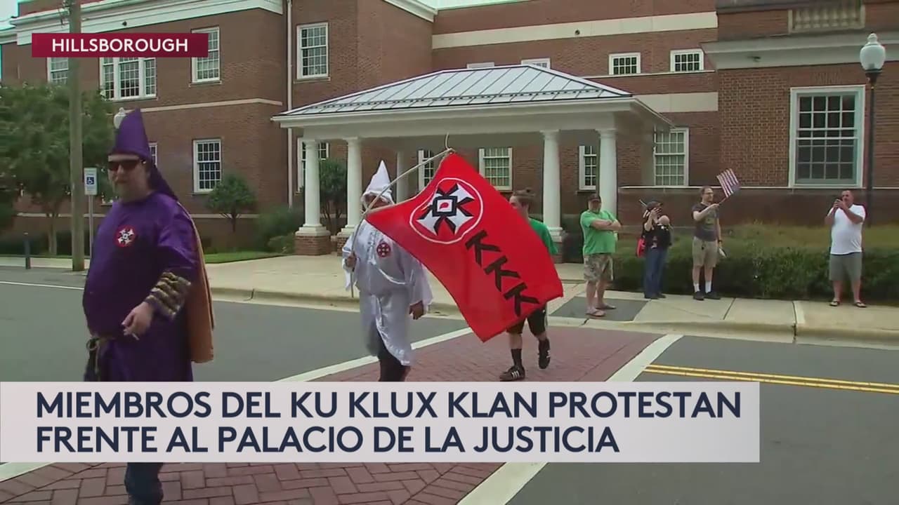 Varios miembros del Ku Klux Klan protestan frente al palacio de justicia en Hillsborough. Manifestantes que rechazan la supremacía blanca también se presentaron en el lugar. La tensión no se hizo esperar.