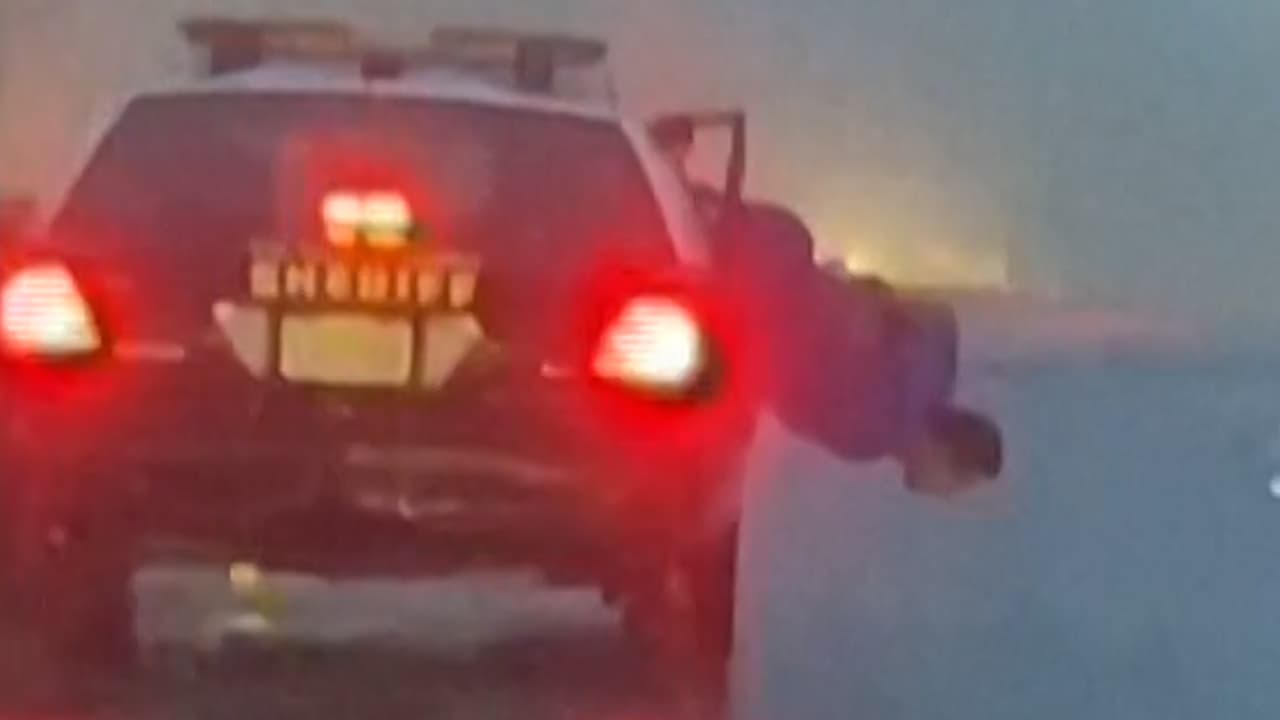 Un recluso esposado intenta escapar por la ventana de una patrulla en movimiento y cae al asfalto