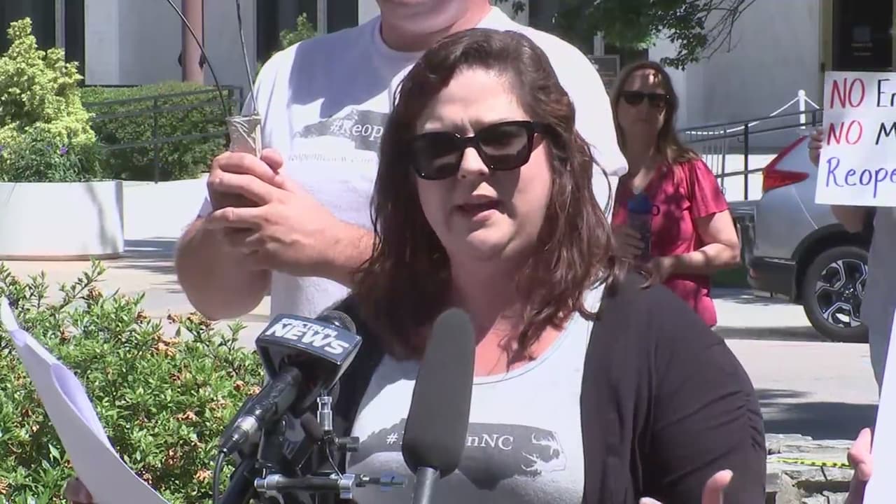 La cofundadora de "ReopenNC", Ashley Smith, realizó una conferencia de prensa el viernes en Raleigh, donde presentó más de 6,000 firmas, instando a los legisladores a vetar la orden del gobernador Roy Cooper sobre el uso obligatorio de mascarillas.