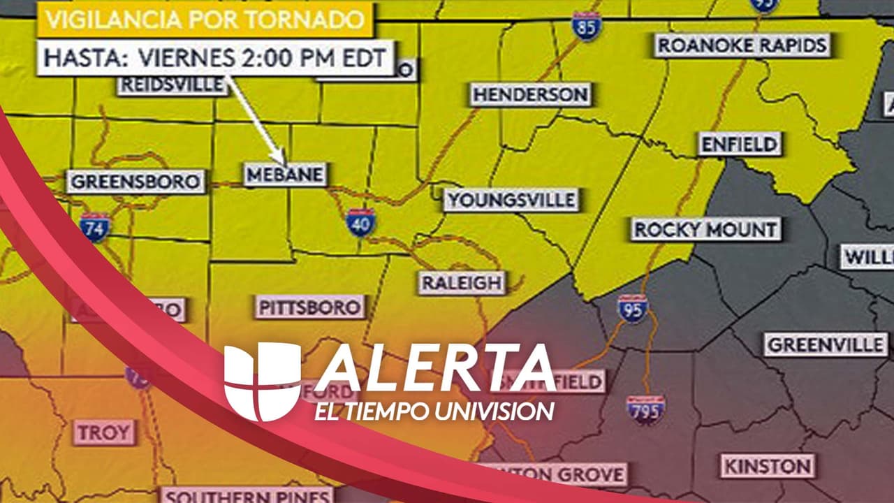 Una vigilancia por tornado fue emitida el viernes en gran parte del estado hasta las 2 p.m. La vigilancia quiere decir que las condiciones están propicias para la formación de un posible tornado. Las áreas bajo alerta incluyeron a Raleigh, Durham, Sanford, entre otras ciudades.