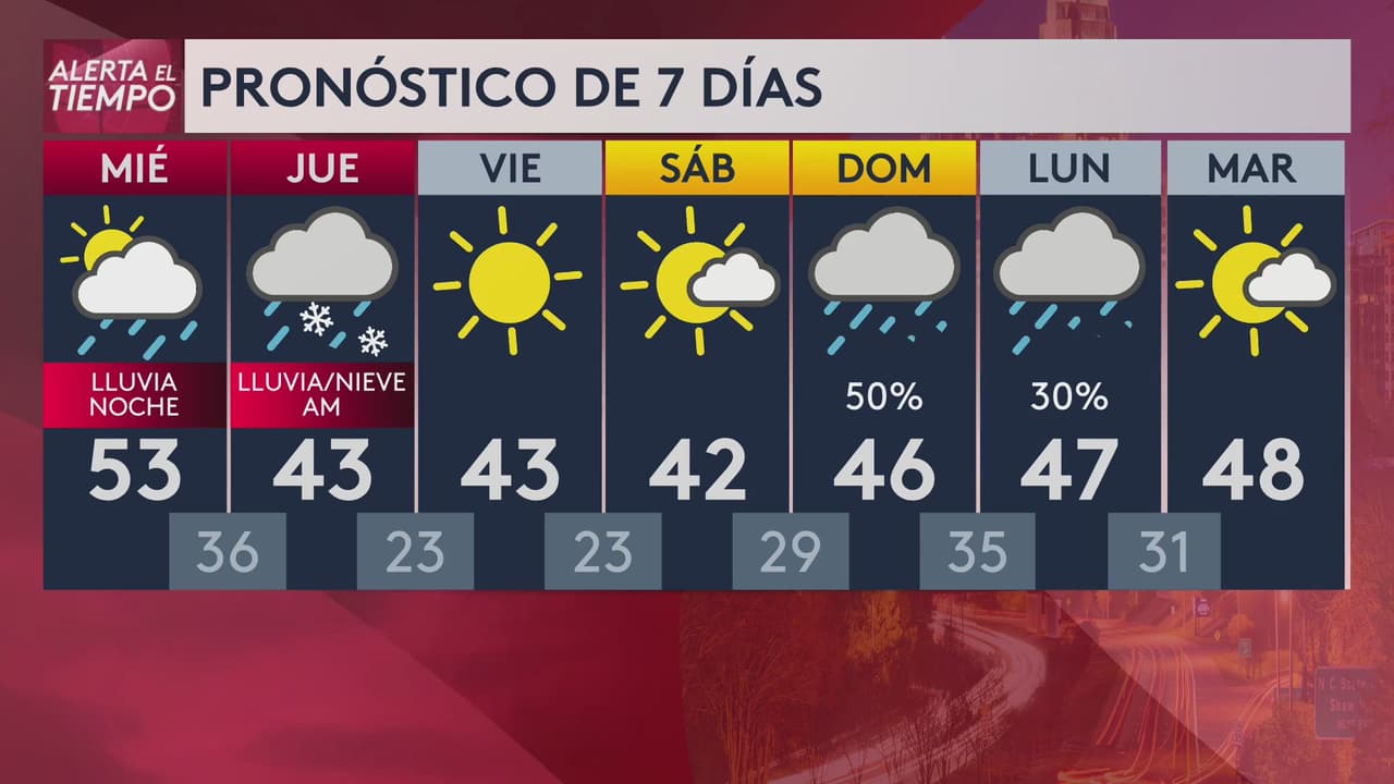 La nieve podría llegar a acumularse la noche del miércoles. Las posibilidades de lluvias aumentarán luego de las 6 pm.