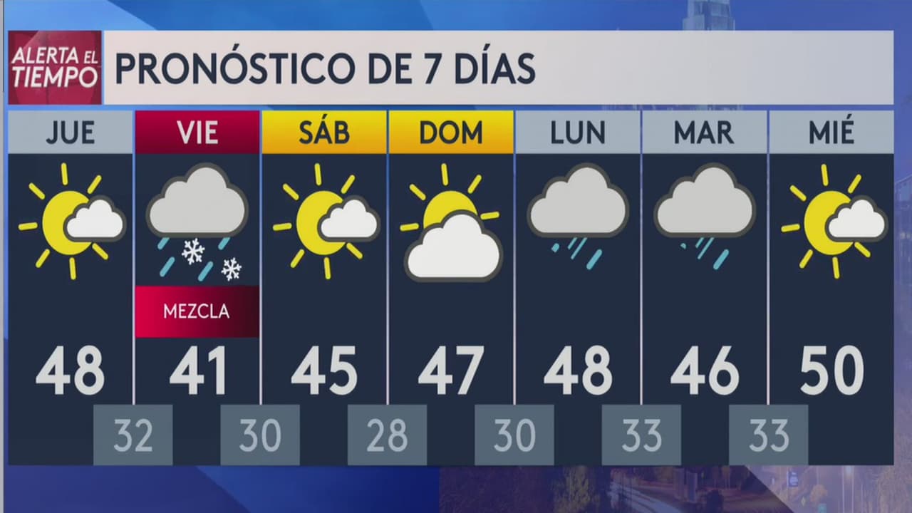 Una mezcla de lluvia y nieve se espera desde la mañana hasta la tarde del viernes en Carolina del Norte. Los acumulados no serán significativos alrededor de la media pulgada. Se esperan cielos parcialmente nublados el jueves con máximas en los 48 grados.