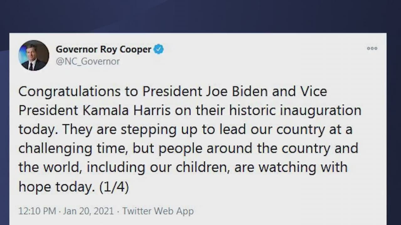 El gobernador de Carolina del Norte, Roy Cooper, felicitó a Joe Biden y Kamala Harris por su juramentación como presidente y vicepresidenta. El mandatario estatal agradeció a los oficiales y uniformados del estado que viajaron a Washington DC para apoyar el dispositivo de seguridad.