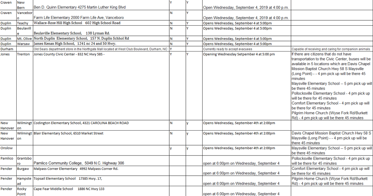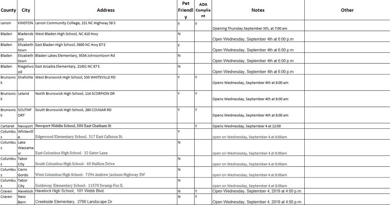 CAROLINA DEL NORTE, Raleigh.-El Centro de Operaciones de Emergencias de Carolina del Norte, ha compartido el listado de refugios disponibles en 16 condados en anticipación a la llegada del huracán Dorian al estado.