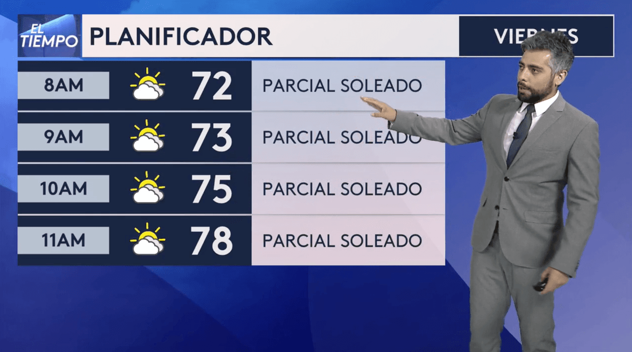 El pronóstico estará más tranquilo en la tarde del viernes. A partir de las 8 a.m. las temperaturas estarán en los 86 grados, con sólo un 20% de probabilidad de lluvias.