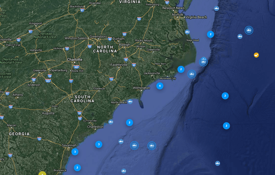 Aunque seis de los más grandes están fuera de las Carolinas de acuerdo con el Dr. Robert Hueter, de OCEARCH, un total de 23 tiburones blancos se encuentran dentro de las 50 millas de las costas de Carolina del Norte y del Sur, mismos que fueron capturados y etiquetados previamente con rastreadores electrónicos.