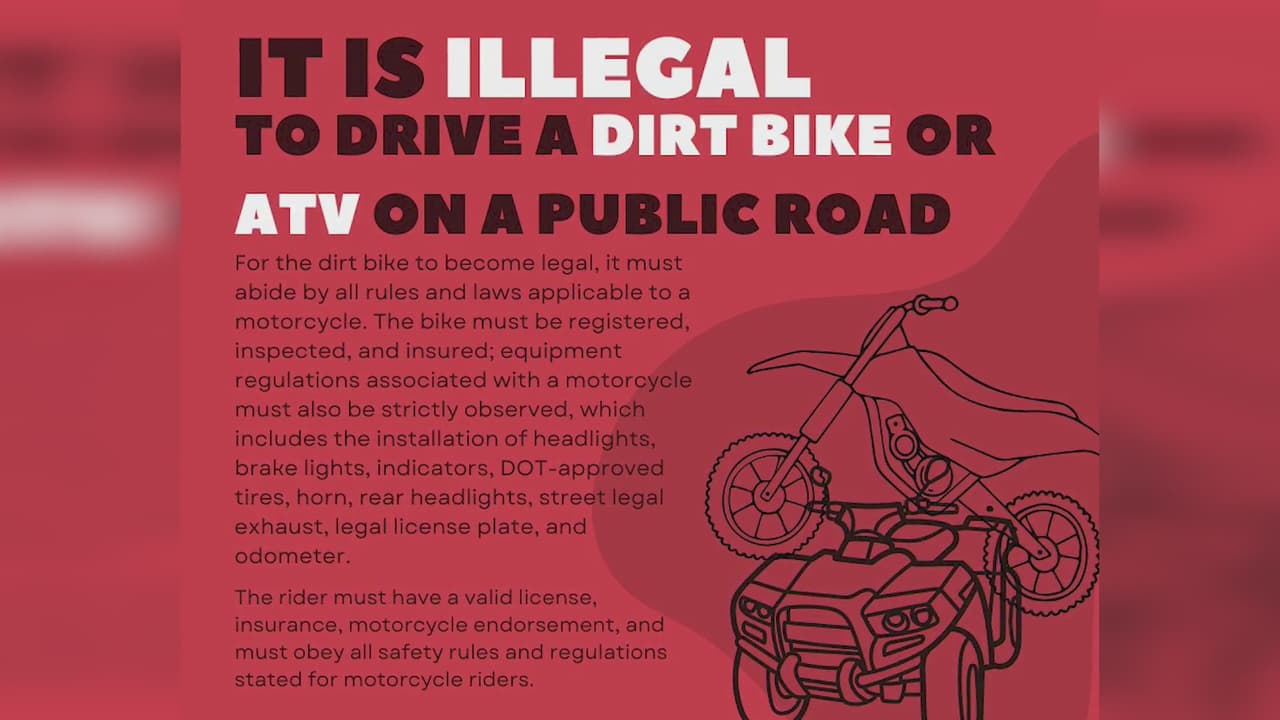 Conducir una moto de cross en cualquier vía o carretera pública es ilegal. El Departamento de Policía de Durham continuará educando al público sobre la posesión u operación legal de una moto todoterreno y un vehículo todo terreno. Estos pasajeros ilegales interrumpen la vida en la ciudad de Durham y ponen en peligro la vida de las personas, incluida la propia.