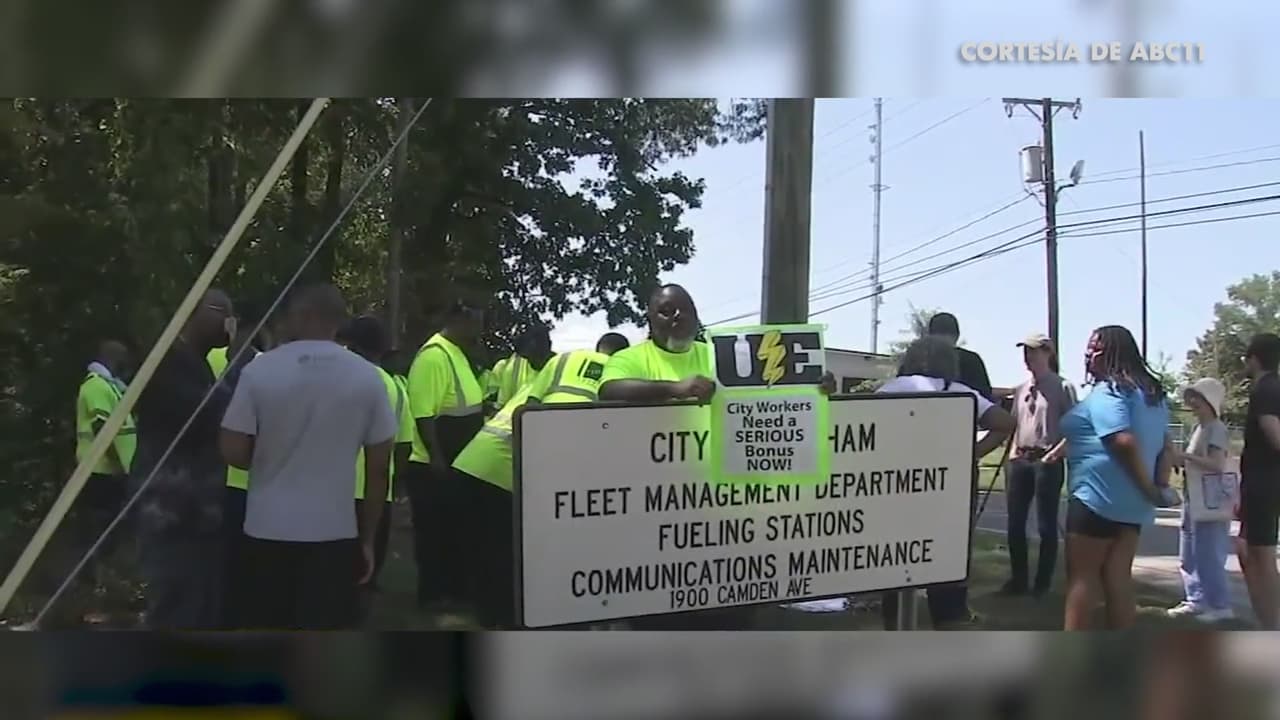 Por segundo día consecutivo, los trabajadores sanitarios de Durham se retiraron y optaron por no salir a sus rutas de recolección de basura el jueves. Los contenedores de basura se alinean en las calles del centro de Durham, esperando ser recogidos por los empleados de saneamiento de la ciudad.