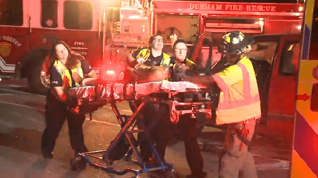 CAROLINA DEL NORTE, Durham.-Un fuerte choque entre una camioneta roja Pick up y un Jeep blanco deja a tres personas heridas esta mañana.