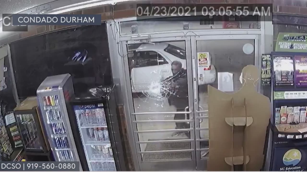 El sujeto rompió la puerta de vidrio de una gasolinera para luego llevarse la caja registradora y el dinero en efectivo en su interior. La Policía de Durham pide ayuda para identificar al ladrón.