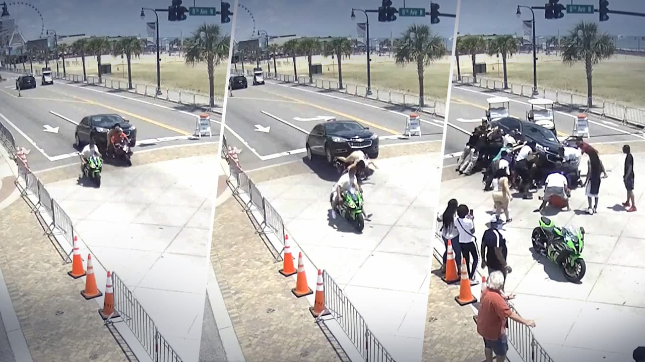 El incidente ocurrido entre una motocicleta con dos pasajeros y un automóvil quedó grabado en video por una cámara de seguridad en Ocean Boulevard.