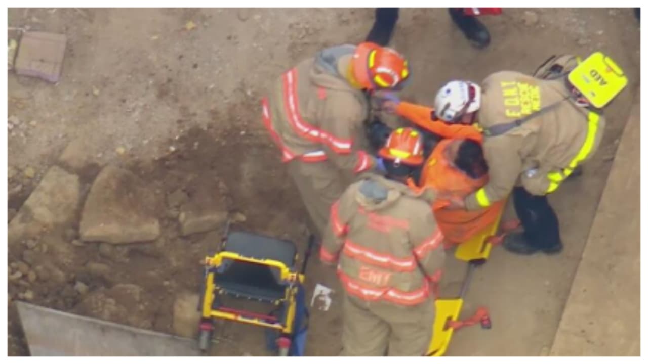 Una trabajadora cayó dentro de un hoyo de excavación y quedó atrapada. Rescatistas lograron sacarla y llevarla de emergencia a un hospital.