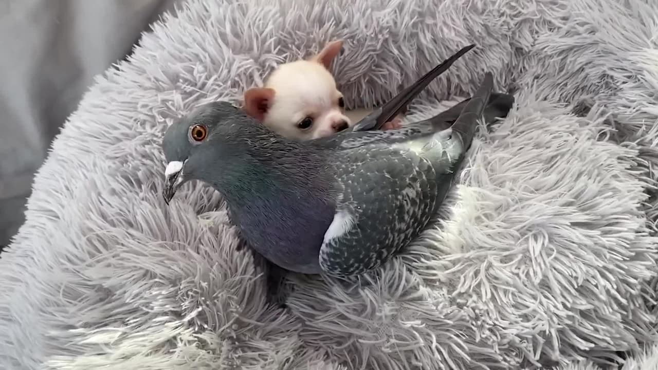 La amistad entre una paloma que no puede volar y un chihuahua que no puede caminar --ambos residentes de un refugio para mascotas discapacitadas en Rochester, Nueva York--, se está haciendo viral en las redes.