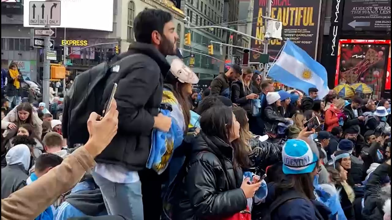 Miles de argentinos se reúnen en Times Square para celebrar su victoria en el Copa Mundial de Fútbol Catar 2022.