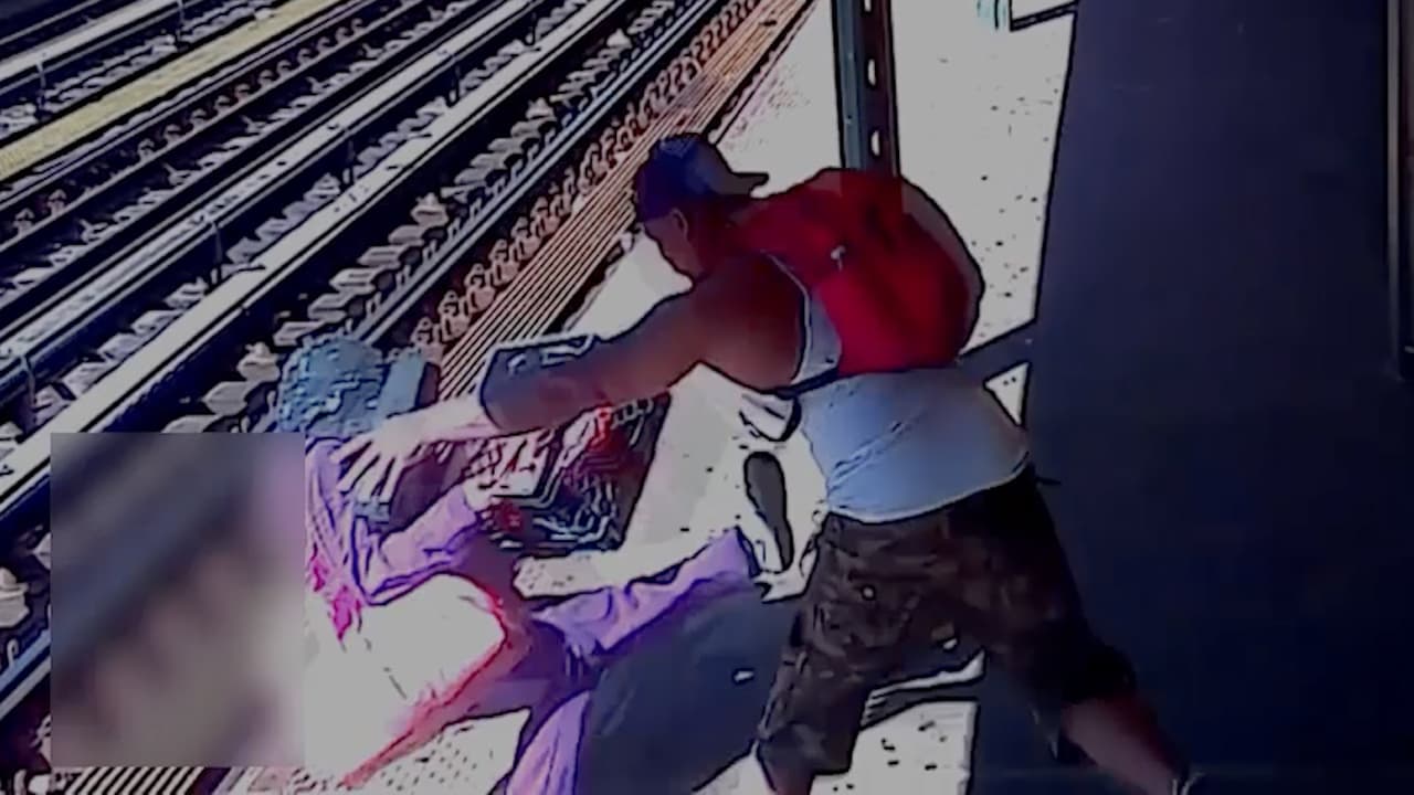 El hombre, que llevaba una gorra de béisbol al revés y una camiseta blanca sin mangas, se acercó a la mujer por detrás, la agarró con ambas manos y la lanzó hacia las vías, según muestra el vídeo.