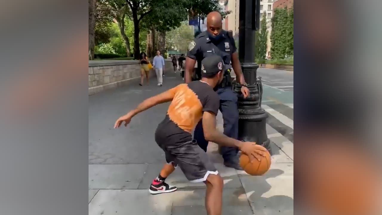 Artista ‘burla’ a un policía y varios peatones con su peculiar juego de baloncesto por Union Square