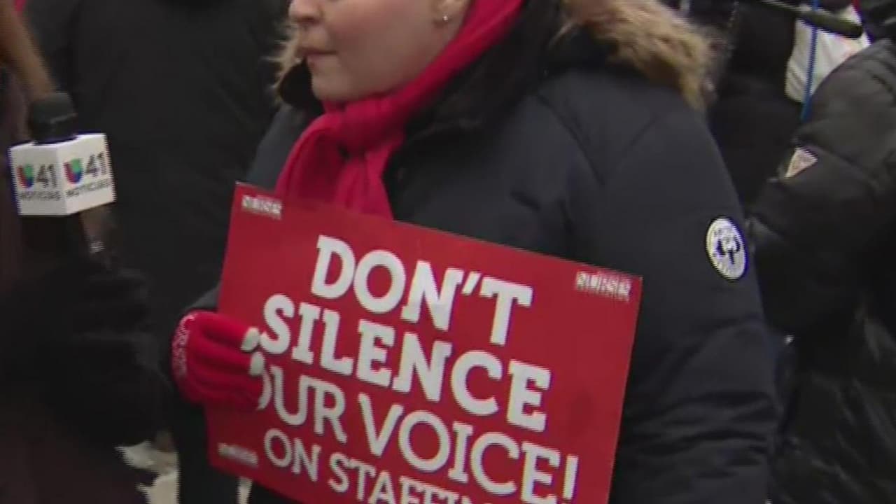 Más de 3,500 enfermeros del Centro Médico Montefiore, en El Bronx, y alrededor de 3,600 del Hospital Mount Sinai, en Manhattan, se manifiestan este martes en las calles de la Gran Manzana para exigir mejores salarios y condiciones laborales. "Estamos peleando porque una sola enfermera tiene demasiados pacientes para tratar", asegura Casilda Adame, una de las trabajadoras que participa en la protesta.