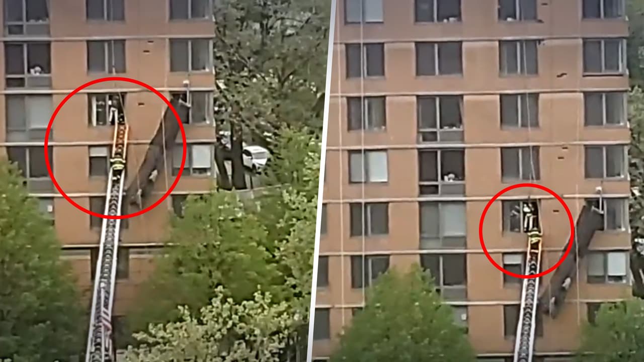 También se ve a un numeroso grupo de integrantes del Departamento de Bomberos de la Ciudad de Nueva York (FDNY), haciendo maniobras para rescatarlos.