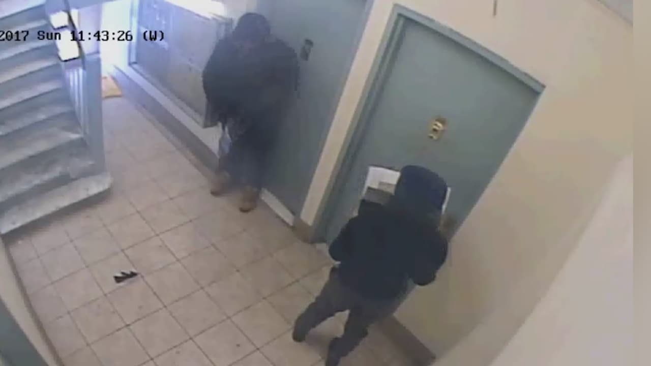 Cámaras de seguridad registraron el momento en que los sospechosos ingresan a un apartamento de la zona y golpearon y amarraron a los residentes mientras hurtaban todo lo que podían.