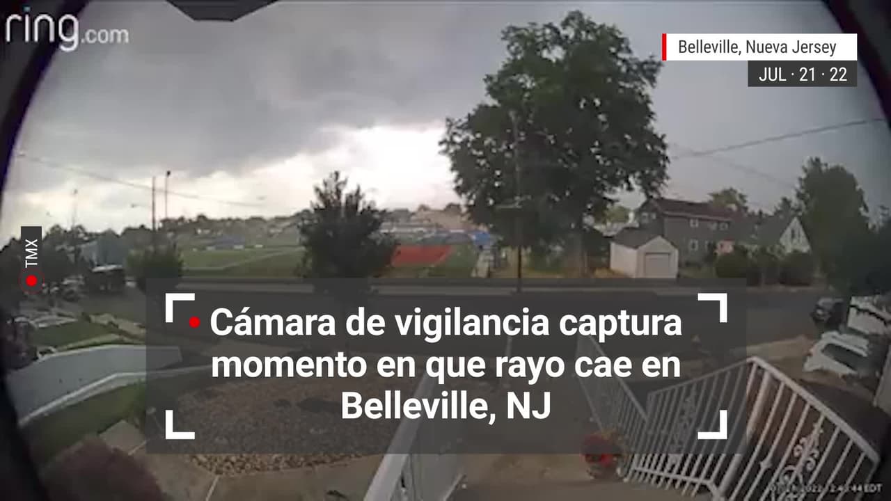 Una cámara de vigilancia doméstica capturó el impacto en que cae un rayo muy cerca de una vivienda en Belleville, Nueva Jersey.