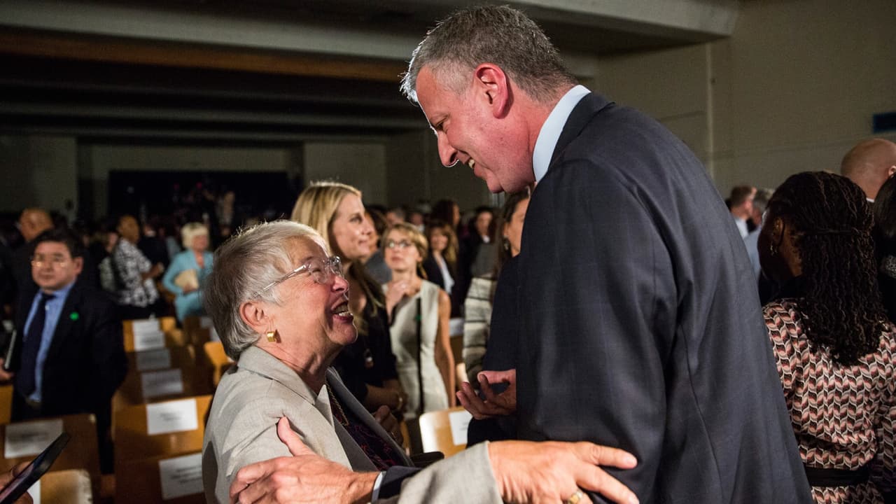 En medio de aplausos y homenajes de los empleados del departamento, el alcalde Bill de Blasio le entregó una proclama a Carmen Fariña en su último día en su cargo como canciller de educación